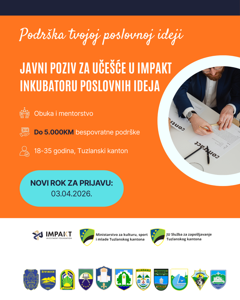 U sklopu zajedničke saradnje između Ministarstva za kulturu, sport i mlade Tuzlanskog kantona, Investicijske fondacije IMPAKT, JU Služba za zapošljavanje Tuzlanskog kantona i 11 lokalnih zajednica Tuzlanskog kantona u 2026. godini realizirati će se program IMPAKT inkubator poslovnih ideja koji će, između ostalog, obuhvatiti program poduzetničke obuke, te finansijsku, stručnu i mentorsku podršku za najbolje ocjenjene poslovne ideje na području Tuzlanskog kantona, u skladu sa raspoloživim finansijskim sredstvima za podršku poduzetnicima.